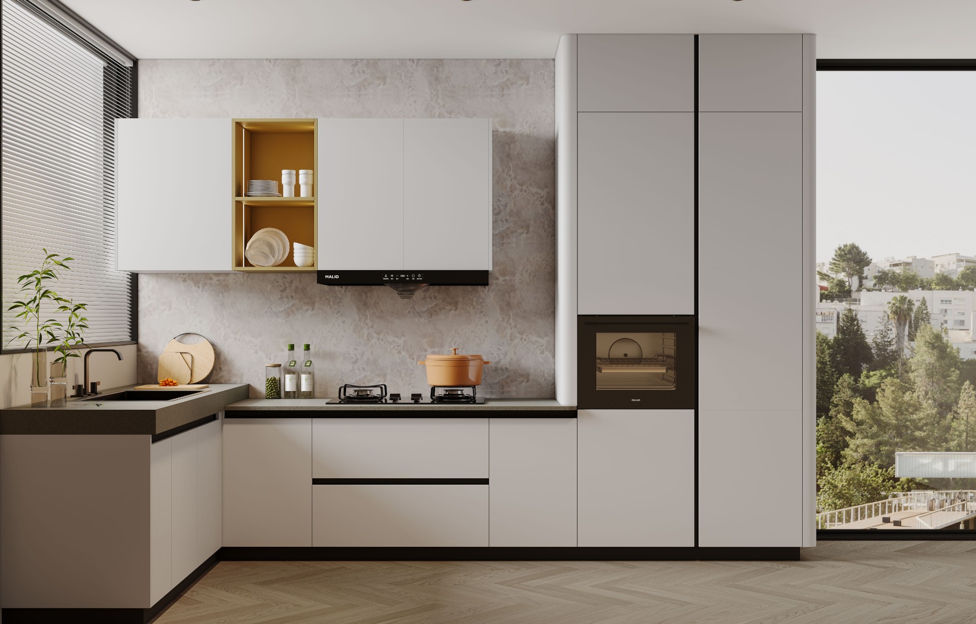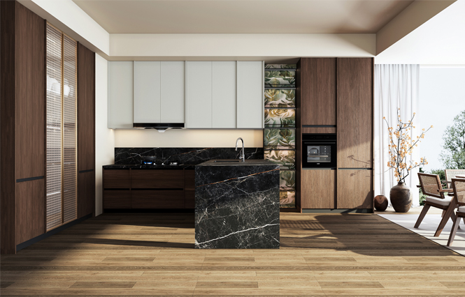 通过PG电子厨柜量体裁柜,定制出适合主厨下厨的烹饪区和洗涤区的舒适高度。